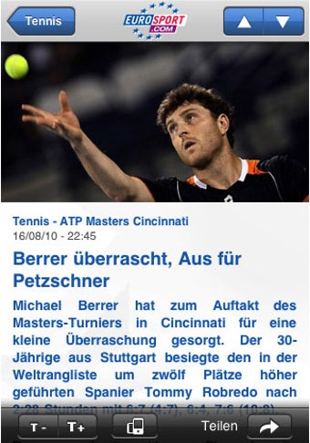 Eurosport.com bringt in der Übersicht Schlagzeilen, während man in den Detailansichten Fotos und Artikel im Original liest. Bei der Live-Option erhält man einen Einblick in gerade stattfindende Ereignisse sowie in beendete und noch in Kürze stattfindenden Turniere.